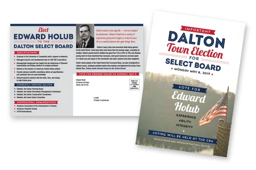 Mr. Holub had a problem: How do you get voters to turn out in an off-year local election and vote for him — while not spending a fortune? Develop a low-cost, targeted postcard with fresh, contemporary graphics that highlight only essential information — brief, persuasive and to the point. Choose a delivery date just a few days before the election and send it Every Door Direct Mail® (EDDM), where a mailing permit, mailing list and addressing are not needed, postage costs are low, and the postcard can be targeted to a tight geographic area. Results? Mr. Holub was elected.